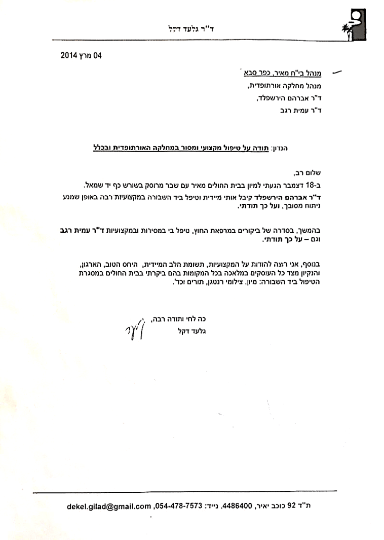 אין דבר מרגש יותר מקבלת מכתבי תודה ממטופלים שמביעים את שביעות רצונם. להלן המלצות ממטופלים מרוצים, שהתקבלו לאחרונה, על טיפול מקצועי ומסור שניתן להם על ידי ד"ר עמית רגב, אורטופד מומחה להחלפת מפרקים. המכתבים וההמלצות מצביעים על השפעת הטיפול וההחלמה, ועל המקצועיות והמסירות של ד"ר רגב.